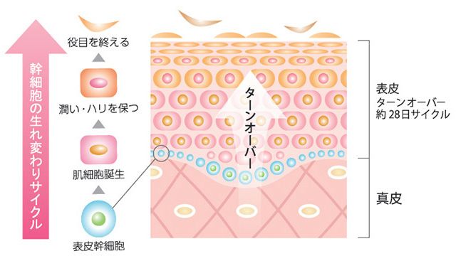 表皮幹細胞より表皮細胞が作り出され、ターンオーバーにより角質層まで押し上げられ肌が新しく生まれ変わっていきます。肌代謝が規則正しく行われることにより、健康な肌が保たれます。ターンオーバー「キレイな角質層を育てるための大切な過程」です。
